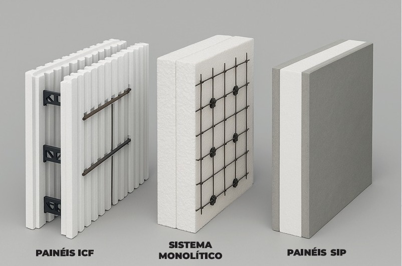 Formas de EPS preenchidas com concreto armado ou painéis monolíticos que oferecem robustez, isolamento e versatilidade.